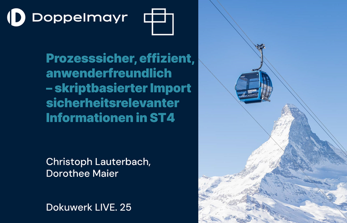 Vortrag von Christoph Lauterbach, Doppelmayr und Dorothee Maier, Dokuwerk KG, zur Dokuwerk LIVE 2025 Prozesssicher, effizient und anwenderfreundlich - skriptbasierter Import sicherheitsrelevanter Informationen in ST4 3,84 MB -