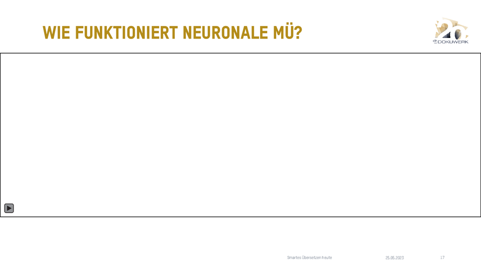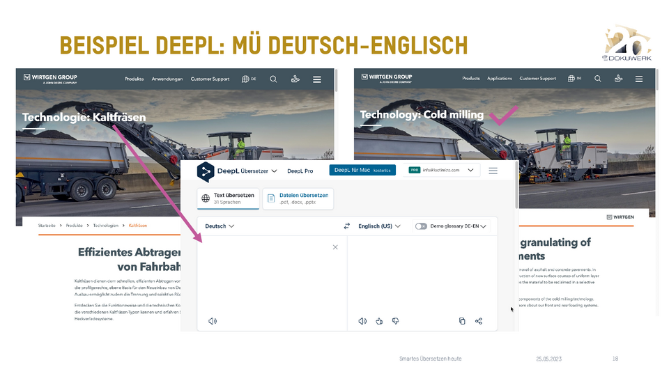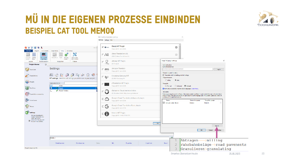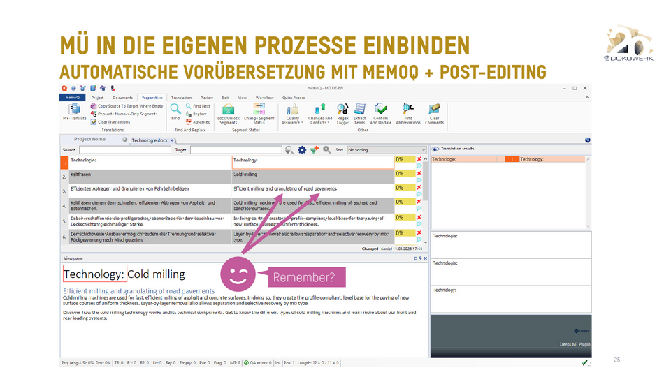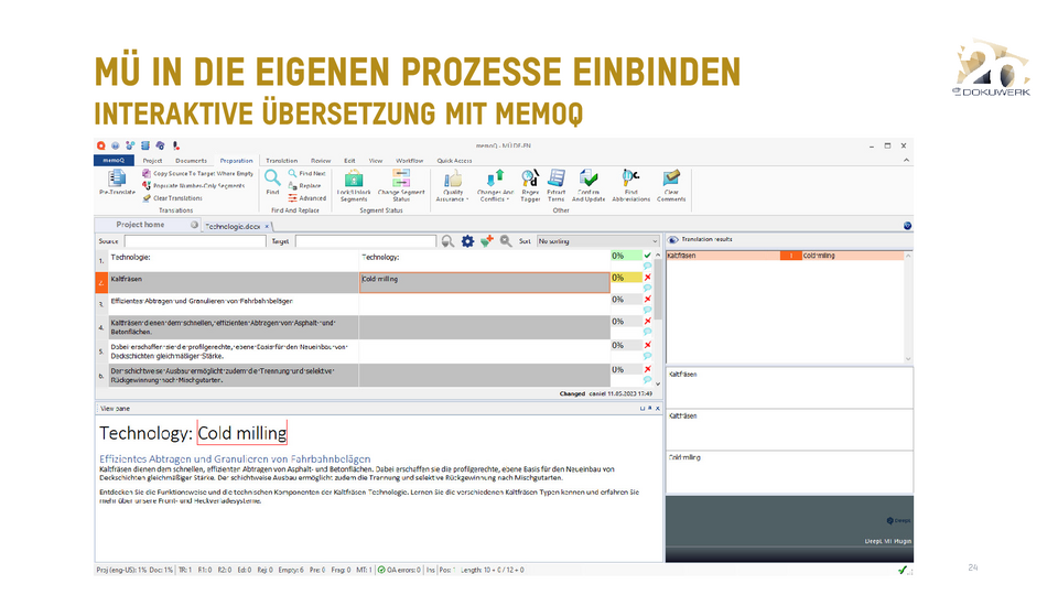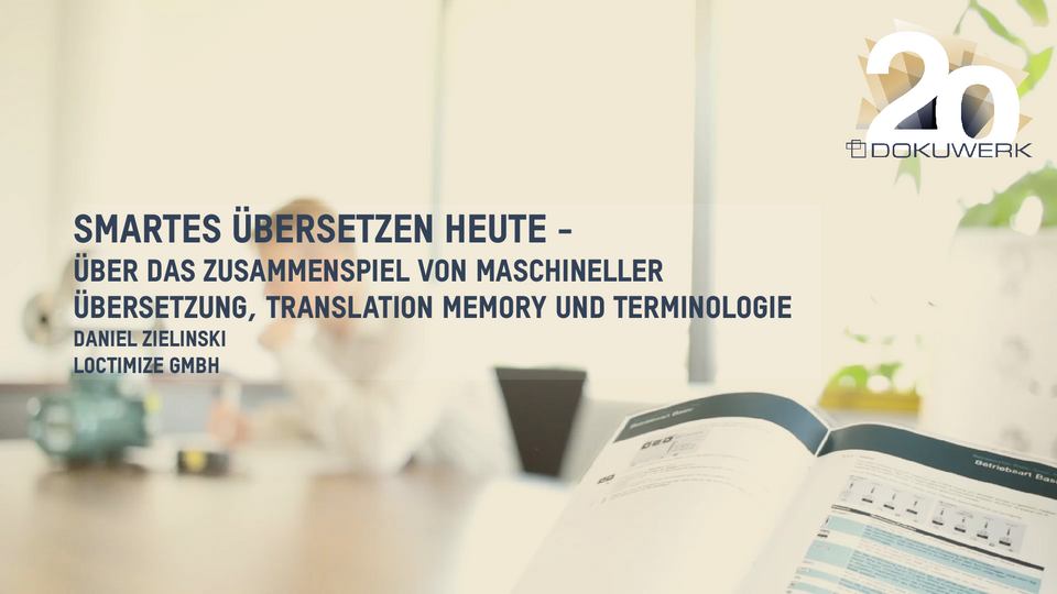 Vortrag von Daniel Zielinski, Loctimize GmbH, zum Dokuwerk Firmenjubiläum 2023 Smartes Übersetzen heute - Über das Zusammenspiel von maschineller Übersetzung, Translation Memory und Terminologie 9,03 MB -