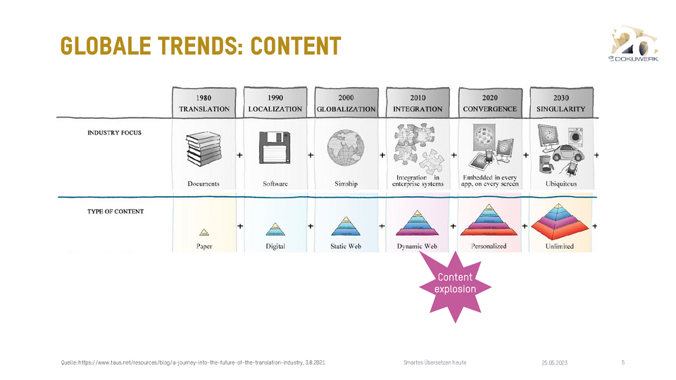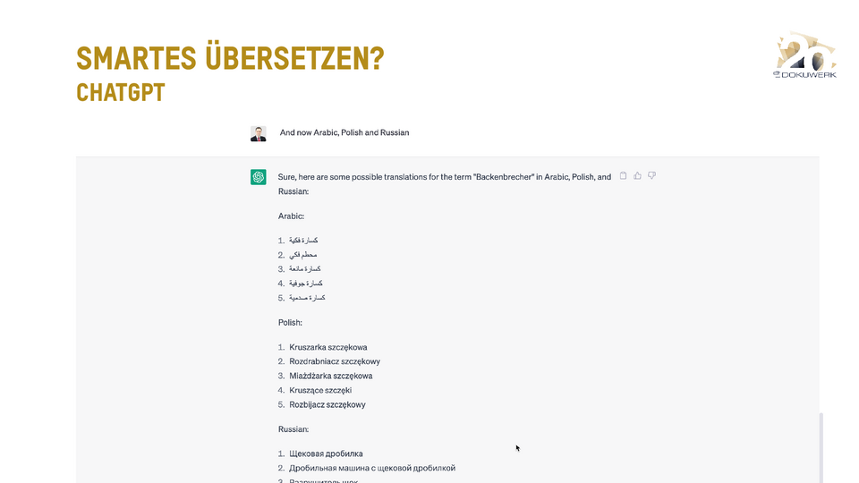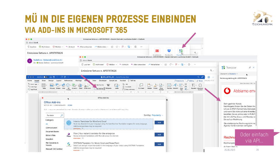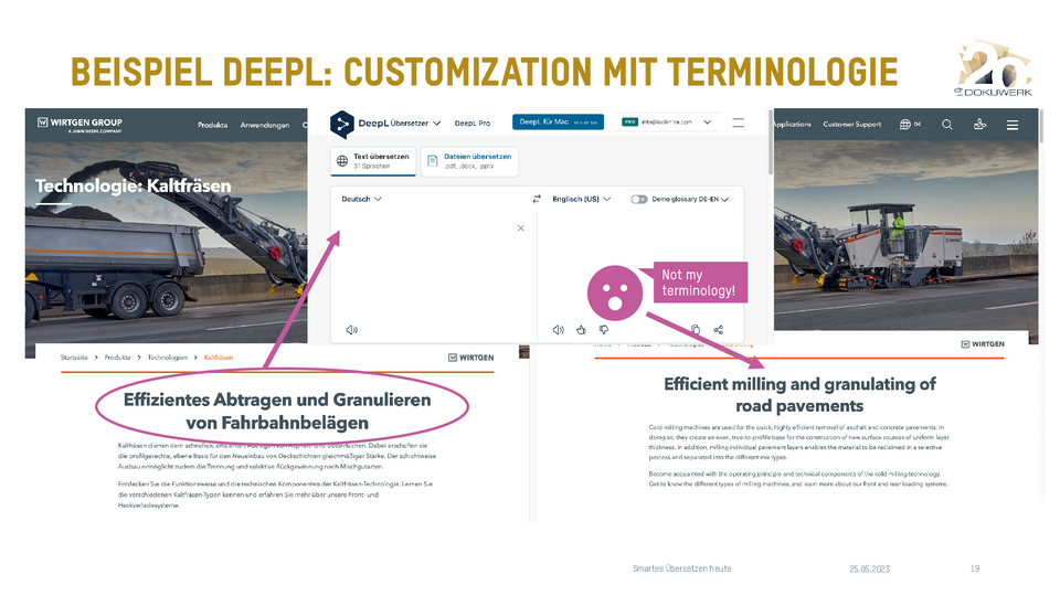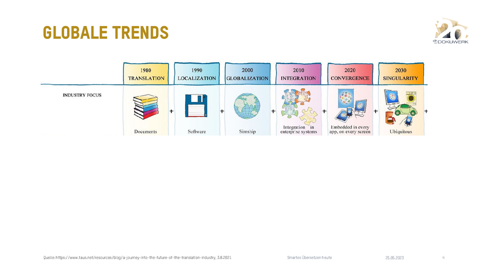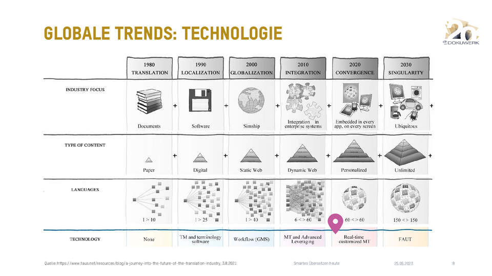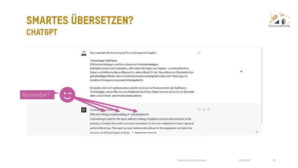 Vortrag von Daniel Zielinski, Loctimize GmbH, zum Dokuwerk Firmenjubiläum 2023 Smartes Übersetzen heute - Über das Zusammenspiel von maschineller Übersetzung, Translation Memory und Terminologie 9,03 MB -